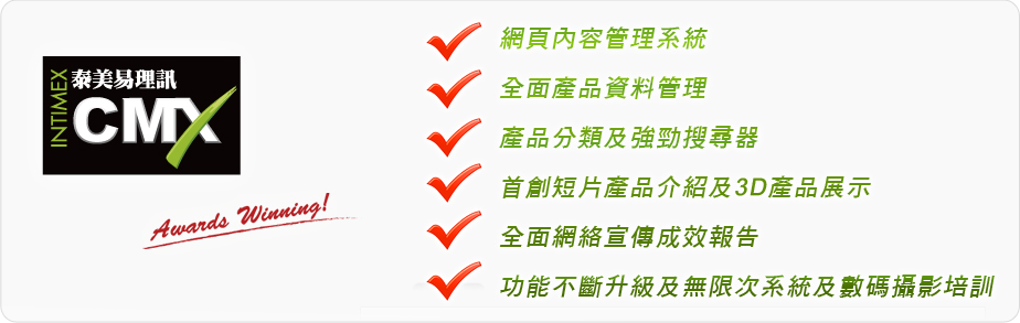 如果界定網站系統是否優質?獲得第三方的嘉許自然是最好的證明。泰美科技100%自行研發的CMX『易理訊』系統,獲得行內最高殊榮的獎項,包括2009香港資訊及通訊科技獎、2008香港工商業獎及2011稻香創意創業大賞,獎項從功能、競爭力、創意等範疇評分,可見CMX於多方面都表現優良;再加上我們定時加入最新功能,助你不斷提升業務競爭力。